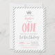 Celebrar um dia especial com este dia moderno de ouro e primeiro aniversário rosa Convite! Este design apresenta um gráfico de coroa giro e uma tipografia de brilho prateado.