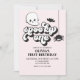 O convite do primeiro aniversario de Dia das Bruxas com fantasma, morcego e aranha.