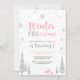 Celebrar um dia especial com este Convite para primeiros aniversarios da Holanda do inverno! Este design apresenta gráficos bonitos de veado e flocos de neve com tema de cor rosa e prateada. Você pode adicionar qualquer cor de fundo.