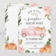 Belo verde e um convite floral de abóbora com um caminhão cor-de-rosa cheio de abóboras.