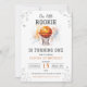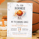 Nosso novato está virando um! Celebre o grande dia do seu filho com este inevitável convite para o primeiro aniversário de basquete. Apresentando uma bola de aquarela e uma frase brincalhona "Nosso pequeno Rookie está virando um", este convite temático esportivo é perfeito para um novato do ano, aniversário de basquete ou celebração de primeiro aniversario de menino.
