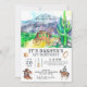 O primeiro convite de aniversário do cowboy ocidental selvagem em terracotta, em browns e blues para um menino, com a cidade ocidental, a barata do cowboy, o lasso, e o cowboy em cavalo. Tudo o que um cowboy precisa. É o primeiro rodeio dele! Você pode personalizar isso para qualquer idade!