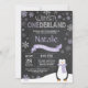 Convite para primeiro aniversario de Winter Onederland. Pinguim. Lavanda Lilac Roxo e Floco de Neve Branco. Primeiro aniversário. Garota 1rua de Dia Convidam. Fundo do quadro.Preto & Branco. Para mais personalização, clique no botão "Personalizar" e use a ferramenta design para modificar este modelo.