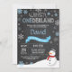 Convite ao primeiro aniversario de Winter Onederland. Homem de neve. Floco de neve azul e branco. Primeiro Aniversário. Convidado para rua. Fundo Chalkboard. Preto & Branco. Para mais personalização, clique no botão "Personalizar" e use nossa ferramenta de design para modificar este modelo.