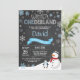 Convite ao primeiro aniversario de Winter Onederland. Snowman e Penguin. Floco de neve azul e branco. Primeiro Aniversário. Convidado para rua. Fundo Chalkboard. Preto e Branco. Para mais personalização, clique no botão "Personalizar" e use nossa ferramenta de design para modificar este modelo.