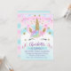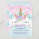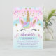 Um belo convite de aniversário de unicórnio com um pouco de bambo. Este design apresenta um rosto unicórnio, duas nuvens, algumas estrelas de coração e dourado falso, uma faixa e dois pequenos unicórnios. O fundo inclui um arco-íris azul e rosa esmaecidos. O esquema de cores é essencialmente azul e cor-de-rosa com toques roxos e verdes. O convite mágico de aniversário do unicórnio arco-íris desta rapariga está pronto para ser personalizado. Para mais designs de convites de aniversário unicórnios, visite a loja.