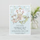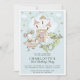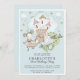 Um reino mágico do castelo aquoso com princesa e dragão, convite de festas de primeiro aniversario de uma menina de ouro azul com uma borda branca. Whimsical, mágico e fofo, para uma criança.