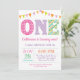Convite para primeiros aniversarios. Primeira festa de aniversário de aniversário. Rosa, Roxo, Laranja, Amarelo, Verde, Azul, Teal, Aqua. Listras. Fundo Branco. Para mais personalização, clique no botão "Personalizar" e use nossa ferramenta de design para modificar este modelo.