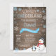 Rustic Winter Onederland primeiro aniversario Invitation. Snowman e Penguin. Floco de neve azul e branco. Primeiro Aniversário. Convidado para rua. Fundo Rustic Wood. Preto & Branco. Para mais personalização, clique no botão "Personalizar" e use nossa ferramenta de design para modificar este modelo.