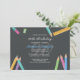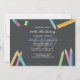 Um quadro, lápis coloridos, um apontador de lápis e um governante adoram o convite de aniversário deste professor. Mude o ano de fundo para refletir o ano de aniversário que você está celebrando.