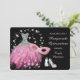 Aqui está um convite elegante e bonito para aquela importante Quinceanera! Apresenta um vestido brilhante e brilhante em prata e rosa brilhante cercado por estrelas prateadas brilhantes. No lado direito do vestido está uma máscara cor-de-rosa correspondente, e um par de calçados prateados repousa no fundo. Seu texto personalizado está em prata e rosa claro no lado direito. Tudo é colocado sobre um fundo preto dramático. O verso do convite também é preto, com mais alguns campos de texto em prata para você personalizar, um coração de prata tiara e uma pena rosa púrpura. Bonito!