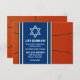 Convite de festa de recepção do Bar Mitzvah com tema de basquete com um fundo de basquete laranja e sotaques de camiseta de basquete azul. Este cartão de inserção de festa de recepção do Bar Mitzvah com tema de basquete é elegante e moderno. Este cartão de recepção do Bar Mitzvah com tema de basquete apresenta um fundo de basquete laranja com uma Estrela de Davi judaica e sotaques azuis. As cores neste design de Bar Mitzvah com tema de basquete são laranja, azul, branco e preto.