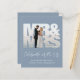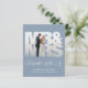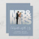 Chic, uma elopeia azul empoeirada única e acessível ou anúncio privado de casamento e convite de recepção. A frente mostra sua foto em um quadro "Sr. & Sra.", "Celebrar conosco" em um roteiro branco de na moda e seus nomes, data de casamento e local em uma simples tipografia branca. No verso, personalize seu convite de recepção e adicione seus nomes casados em um script branco tipo assinatura.