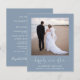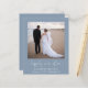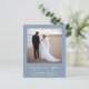Um elopemento azul empoeirado, amigável em orçamento, ou anúncio privado de casamento e convite de recepção apresentando sua foto, "feliz para sempre" em um roteiro branco de na moda, com sucos e seus primeiros nomes, data do casamento e local. No verso, personalize o anúncio do casamento em mais detalhes, adicione uma recepção ou convite de festas e assine seus nomes casados em um roteiro semelhante a assinatura.