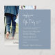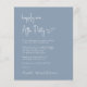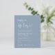 Um elopemento azul empoeirado, amigável em orçamento, ou anúncio privado de casamento e convite de recepção de casamento com a apresentação "Feliz Nunca Depois da Festa" em um roteiro branco moderno, seu convite na tipografia serif branca clássica e seus nomes em um roteiro semelhante a assinatura. O verso mostra sua foto, nomes e datas de casamento e recepção.