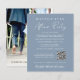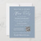 Um elopemento azul empoeirado, ou anúncio privado de casamento e convite recepção de casamento com "Feliz Festa Nunca Depois" em uma simples tipografia branca e um moderno roteiro branco. Personalize seu anúncio e convite e adicione seus nomes em um script semelhante a assinatura. Introduza o endereço URL do Web site do casamento para criar um código QR para os convidados a pesquisar todos os detalhes e para RSVP online. O verso mostra sua foto favorita do casamento, seus nomes e data do casamento.