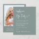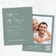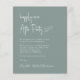 Convite à recepção de casamento verde de sábio, amigável em orçamento, com "Feliz Sempre Depois da Festa" em um roteiro branco chic, seu convite na tipografia clássica de serifa branca e seus nomes em um roteiro branco parecido com assinatura. No verso, adicione sua foto e insira o endereço do seu site de casamento para criar um código QR que seus convidados podem digitalizar para RSVP on-line e obter detalhes adicionais.