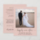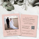Um anúncio de casamento privado ou elopemento cor-de-rosa, com orçamento favorável, com um convite de recepção com a sua fotografia, "feliz para sempre" num roteiro de caligrafia com baloiços e seus primeiros nomes, data do casamento e local. No verso, personalize seu anúncio de casamento e sua recepção ou convite de festas, insira seu endereço URL do site de casamento para criar um código QR para os convidados digitalizarem suas fotos de casamento, todos os detalhes e para RSVP on-line e assine seus nomes casados em um roteiro semelhante a assinatura.