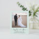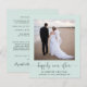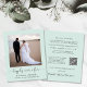 Um elopemento verde de menta leve e orçamental ou anúncio privado de casamento e convite para recepção de casamento postada com sua foto, "feliz para sempre" em um roteiro de caligrafia com baloiços e seus primeiros nomes, data do casamento e local. No verso, personalize seu anúncio e recepção ou convite de festas, insira seu endereço URL do site de casamento para criar um código QR para os convidados digitalizarem suas fotos de casamento, todos os detalhes e para RSVP on-line e assinar seus nomes casados em um script semelhante a assinatura.