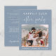 Elemento azul empoeirado e empoeirado / anúncio privado de casamento e convite de recepção apresentando sua foto, "Felizmente, nunca depois da festa" em uma simples tipografia branca e um roteiro branco chique com balsas e seus nomes e data de casamento. No verso, insira o endereço de URL do seu site de casamento para criar um código QR para os convidados pesquisarem todos os detalhes e para RSVP online, personalizem seus detalhes de lançamento e recepção e adicionem seus nomes em um script branco tipo assinatura.