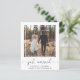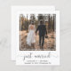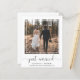 Elemento amigável do orçamento de chic ou anúncio de casamento privado e convite de recepção. A frente mostra sua foto de casamento em um quadrado recortado, "recem casados" em um roteiro de na moda com pestanas e seus primeiros nomes, data de casamento e local na tipografia moderna. No verso, você pode personalizar seu anúncio de casamento, adicionar uma recepção ou convite de festas de celebração e assinar seus nomes em um roteiro semelhante a assinatura.