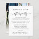 Um anúncio de casamento privado ou de orçamento favorável à chic combinado com uma recepção de casamento postada ou um convite de festas de celebração. Na frente, "Feliz Festa Nunca Depois" é escrito em uma simples tipografia e um roteiro de na moda com pestanas. Personalize seu anúncio e convite de casamento e adicione seus nomes em um script semelhante a assinatura. O verso mostra sua foto favorita do casamento, seus nomes e data do casamento.