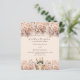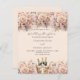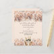 Um convite moderno, na moda e glamouroso para uma recepção de casamento. Creme, fundo colorido de pêssego, decorado com uma cesta de flautas, frascos de vinho espumante e pêssego, flores cremosas. Personalize e adicione seus nomes e detalhes. 1 folha = 1 convite impresso de borda a borda.