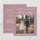 Elogio de rosa empoeirado, ou pequeno anúncio de casamento e convite de recepção. A frente apresenta sua foto e "Feliz Festa Nunca Depois" em uma mistura de simples tipografia branca e na moda branco com supressões. Em sua foto, adicione seus primeiros nomes e a data do casamento. No verso, personalize seu anúncio de casamento e seu convite de recepção em mais detalhes, insira seu endereço de URL do site de casamento para criar um código QR para os convidados digitalizarem suas fotos de casamento, todos os detalhes e para RSVP on-line, e adicione seus nomes em um script semelhante a assinatura.