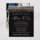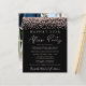 Elemento negro de orçamento ou anúncio privado de casamento e recepção de casamento ou convite de festas de celebração. A frente apresenta o confete de brilho rosa dourado e "Felizmente, nunca depois da festa" em uma mistura de simples tipografia rosa de ouro leve e um roteiro chic e moderno de ouro rosa. Personalize seu anúncio e convite e adicione seus nomes em um script semelhante a assinatura. O verso mostra sua foto de casamento, seus nomes e a data do casamento.