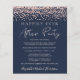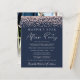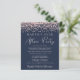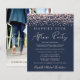 Marinho azul escura e amigável, ou anúncio privado de casamento e convite para recepções de casamento. A frente apresenta o confete de brilho rosa dourado e "Felizmente, nunca depois da festa" em uma mistura de tipografia rosa de ouro leve e um roteiro chic, moderno de ouro rosa. Personalize seu anúncio e convite e adicione seus nomes em um script semelhante a assinatura. O verso mostra sua foto de casamento, seus nomes e a data do casamento.