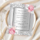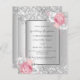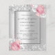 Fundo de aspecto fino prateado decorado com flores brancas e cor-de-rosa, flores e brilho fino prateado, brilhos. Personalize e adicione seus nomes e detalhes do casamento. Letras negras. 1 folha = 1 convite impresso de borda a borda.