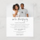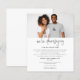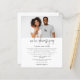 Um preço orçamentário menor, alternativo de papel de 4,5" x 5,6", com a opção de adicionar envelopes, se desejar. Se as circunstâncias significarem que foi necessário diminuir o tamanho do seu casamento, convide os seus convidados para a transmissão em direto da sua cerimônia e aconselhe-se a fazer downsizing. Este design tem sua foto no topo e a tipografia abaixo, com estamos baixando em um script de na moda. O resto do texto que você pode personalizar facilmente. Você também pode alterar as cores do texto e do plano de fundo em ambos os lados, se desejar através da opção Personalizar mais.