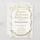 Este clássico convite de festas de aposentadoria surpresa na moda apresenta fundo branco com pistas douradas falsas.