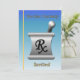 Este convite à aposentadoria azul e dourado é decorado com uma argamassa e um caldeirão.