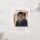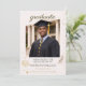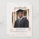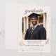 Tema de retrato acadêmico com sotaques de ouro quente em um fundo de creme suave, apresentando uma foto centralizada do graduado emoldurada por detalhes sutis de confetes e pequenos ícones acadêmicos. Tipografia cursiva e serifa combinam com um layout limpo adequado para anúncios de formatura universitária e reuniões de celebração no campus.