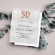 Um convite moderno, na moda e glamouroso para a 50ª festa de aniversário. Um fundo com aparência de prata falsa, decorado com poeira brilhante. Personalize e adicione o seu nome e detalhes da festa. O número 50 é escrito com uma fonte do estilo do balão rosa dourado, script.