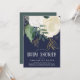 Um convite bonito e moderno para o chá de fraldas, em marinho, verde, branco e cinzento, com rosas de aquarelas e folhas e letra de estilo gravada de pincel.