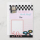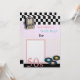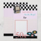Um convite no estilo de 50 do shimmer de cor pérola de 5" x 7" com uma imagem de um arquivo de mesa clássico e registros de 45 rpm em um fundo misto de uma prancha de xadrez em preto e branco, bolinhas cor-de-rosa sólido, cor-de-rosa em branco e preto. Personalize com os detalhes do seu partido. Fonte sugerida: Pai 'O Hip. O fundo tem o mesmo fundo misto. Consulte o convite de quebra-cabeça correspondente, envelope, etiqueta e adesivo. Consulte a coleção inteira de Convite de Noventa 50 nos CONVITES | Seção Convites.