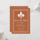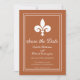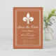 Convite elegante e simples para salvar a data do casamento, apresentando uma fleur de lis contra um fundo de ferrugem. Este design é uma escolha única para anunciar um casamento moderno. Fácil de personalizar com os detalhes do seu casamento. Clique em "Personalize" para encontrar mais opções de personalização.