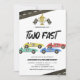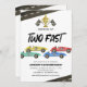 Convites de segundo aniversário de corridas para rapazes com um simples fundo branco, 4 carros de corridas de aquarela, estradas, bandeiras com verificação, um troféu e um modelo de celebração de aniversário de criança que é fácil de personalizar.