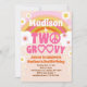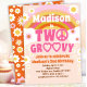 Duas pequenas hippie hippie dos anos 60 e 70, moças, tema de energia floral, convite para segundo aniversário com um retrô arco-íris, sinal de paz, óculos de sol cardíacos e flores margaridas. Mostarda cor-de-laranja rosa, cor-de-rosa e cor-de-rosa amarela pastel e castanha.