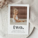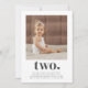 Um segundo aniversário moderno com sua própria foto e a palavra 'dois' com um coração por baixo. Você também pode editar toda a cor e estilos do texto, além da cor do coração, se quiser. Basta clicar no botão 'Personalizar' -> 'Editar usando a ferramenta design'.