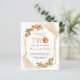Este segundo convite de aniversário do tema dos citros apresenta uma estrutura geométrica dourada adornada com laranjas aquáticas. A palavra "DOIS" aparece em letras maiúsculas laranja com uma cor laranja em vez de "O". Adicione o nome e o aniversário da sua pequena gravata no moderno guião laranja e os detalhes da festa no sans serif preto. A parte traseira da placa é uma forma pastel de laranja que corresponde aos realces de aquarela na parte frontal. Um tema ideal neutro em termos de gênero para uma segunda festa de aniversário de Verão!