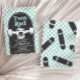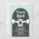 Skateboard Two Rad, convite para segundos aniversários com cheque azul e skateboard.