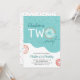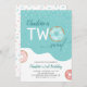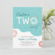 Este convite de aniversário de chá bonitinho foi projetado para uma garota fazendo 2 anos. O texto moderno diz "(Nome) é DOIS doces", acentuado com uma rosquinha fosco com aspersores.