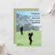 Para o golfista dedicado, um convite de celebração de aniversário que ele vai amar! O convite apresenta um campo de golfe com um primeiro plano verde e árvores a distância e duas silhuetas de golfe. O dorso tem cores coordenadas em um padrão de xadrez.O cartão é fácil de personalizar com seu texto, fonte, cor da fonte e escolha de seis tipos de papel.