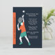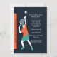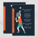 Um convite para o tênis de aniversário de um entusiasta. O cartão tem um tênis homem jogador prestes a servir a bola. As cores laranja, cor branca e negrito saltam para o fundo preto.