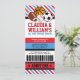 Celebre seu Chá de fraldas de Casais desportivos com nosso bilhete de chá de fraldas desportivo estrelado Convite. Design apresenta uma bola de futebol, beisebol, basquetebol e rugby/futebol num estilo de passagem de entrada de um estádio desportivo. Este design é perfeito para todos os Chás de fraldas desportivos, festas de Chá de fraldas desportivo, todos os casais de esporte estrela ou convites para jogos desportivos.