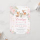 Um convite feito por uma garota de aniversário de terras arborizadas, uma maravilha rosa e bonita, com animais da floresta: raposa, coelho e veado.