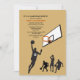 Um convite de cor de areia com silhuetas de jogadores de basquete e uma cesta. O jogador da frente pula para fazer uma enterrada e usa o número relacionado à idade do menino. O cartão é fácil de personalizar com sua redação, fonte, cor da fonte e escolha de seis tipos de papel.